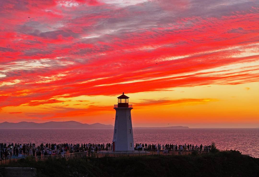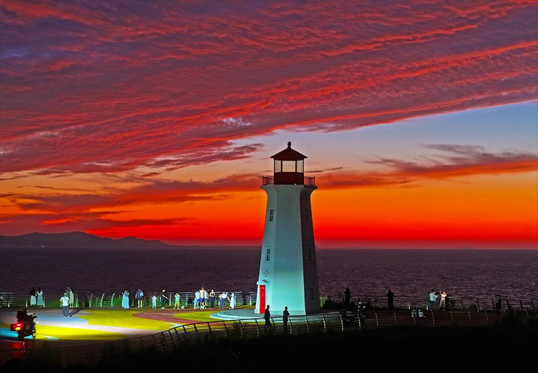 At Boxia Bay in Dalian, Liaoning Province, a lighthouse appears particularly magnificent against the fiery sunset glow. The sky is shrouded in a vibrant red, presenting a splendid sight across the horizon.