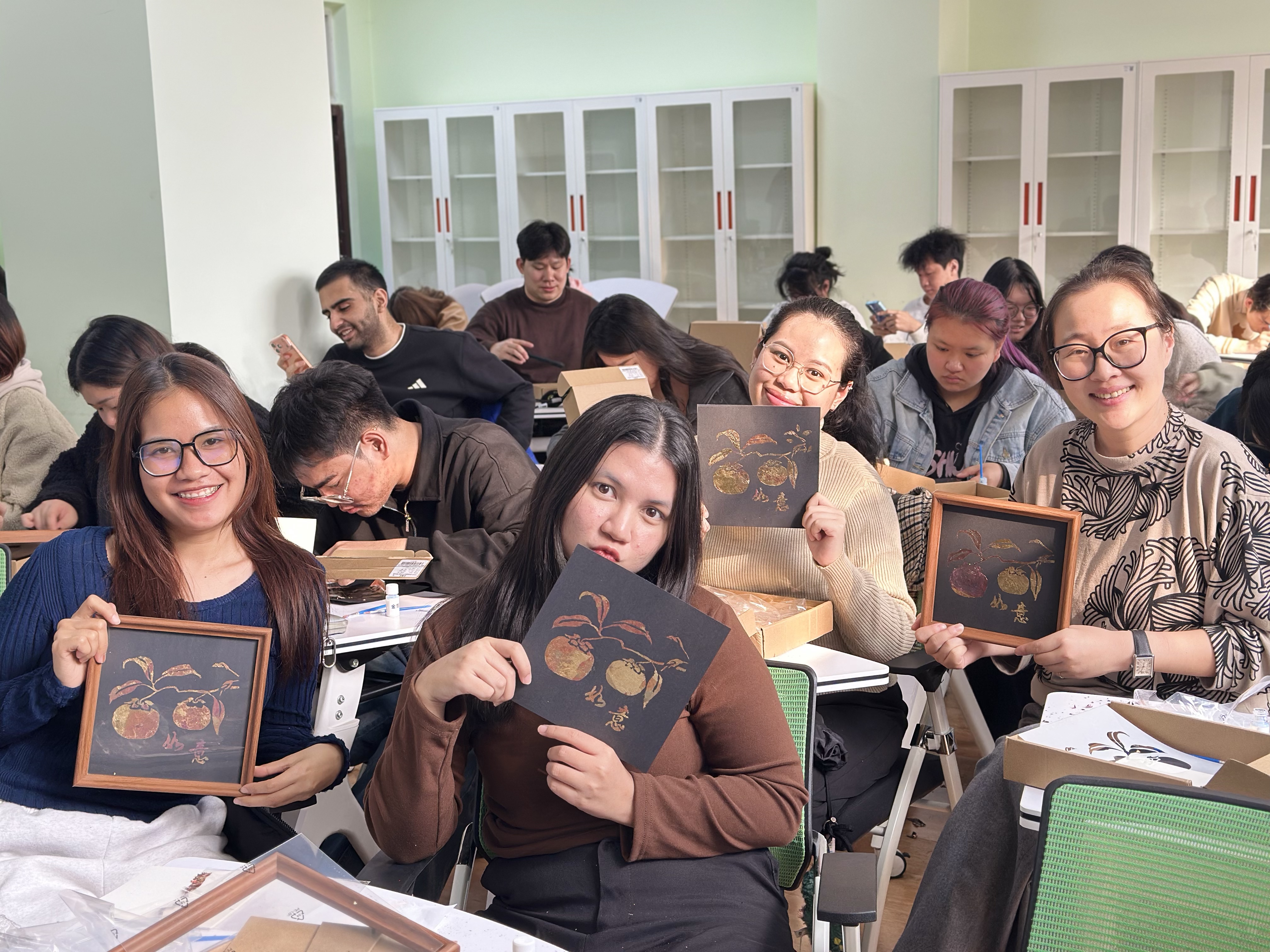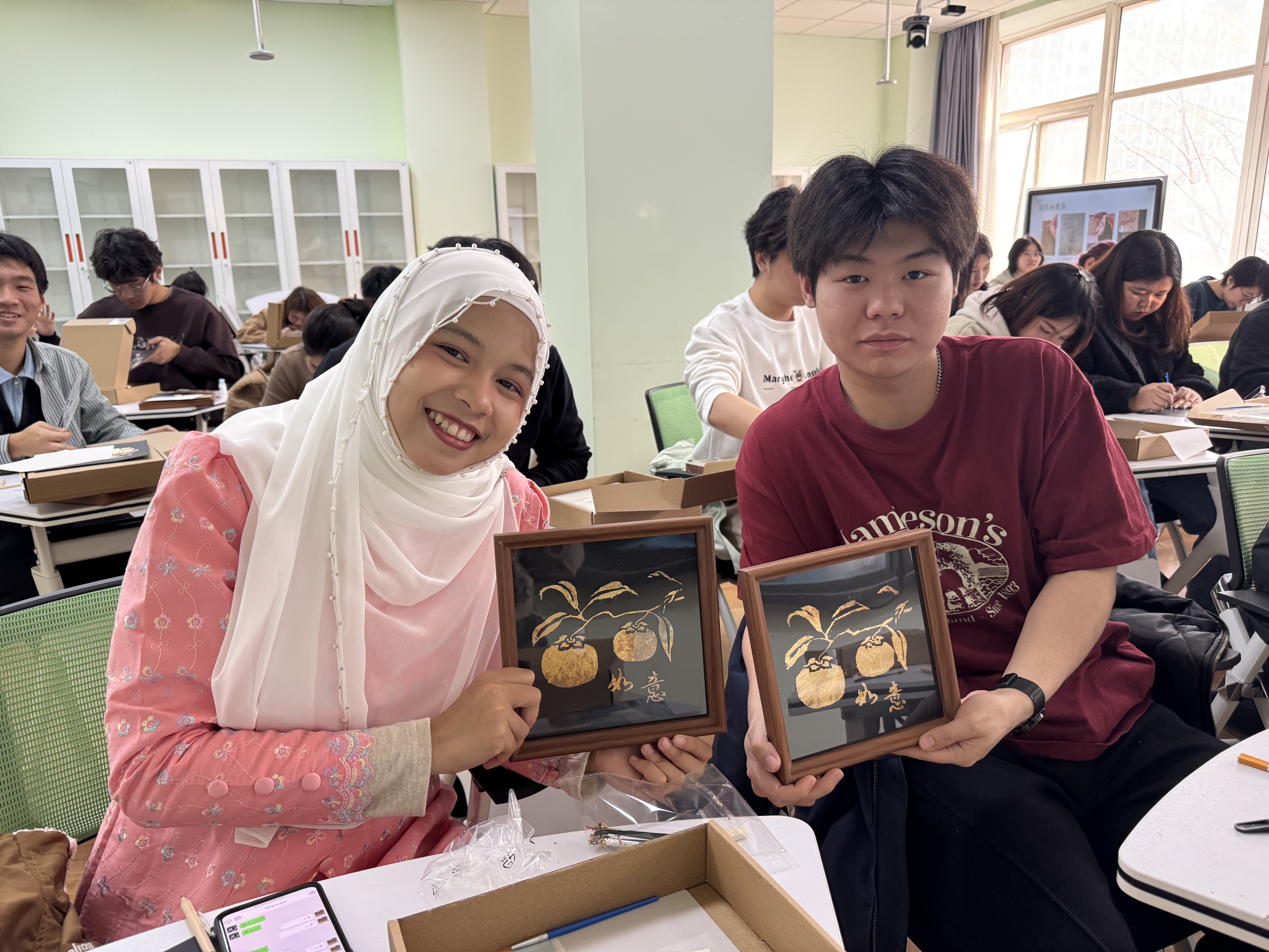 On November 12, the International Education College of Liaoning University of Traditional Chinese Medicine held a themed event on traditional Chinese culture, entitled “Intangible Cultural Heritage Foil-Burning Painting: The Romantic Splendor of Sparkling Gold”. International students from countries such as Sweden, Thailand, Iran, and Hungary gathered together to create foil-burning paintings under the theme of “auspicious persimmons”.