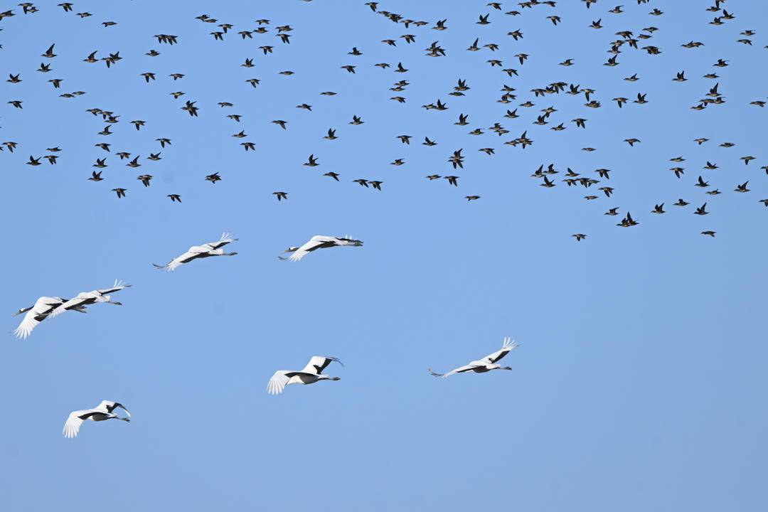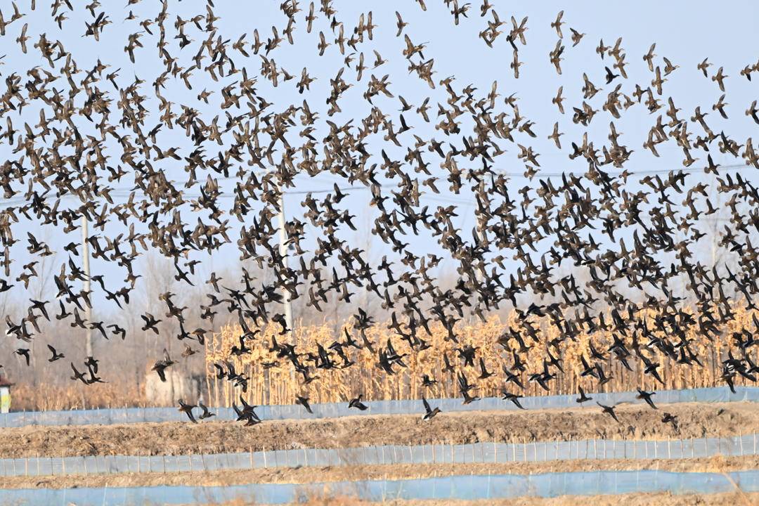 In the Liaohe River Delta of Panjin, Liaoning Province, tens of thousands of migratory birds gather for wintering. They soar into the sky, swirling, scattering, and reforming in mesmerizing patterns.