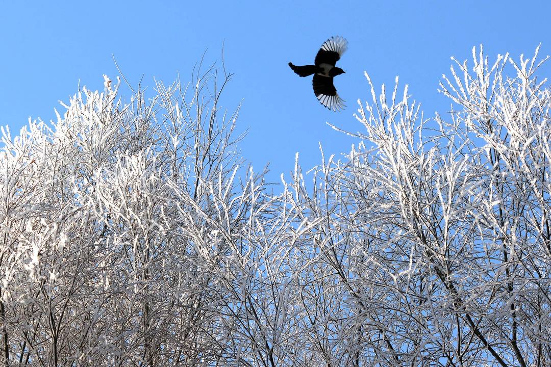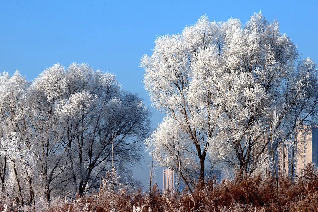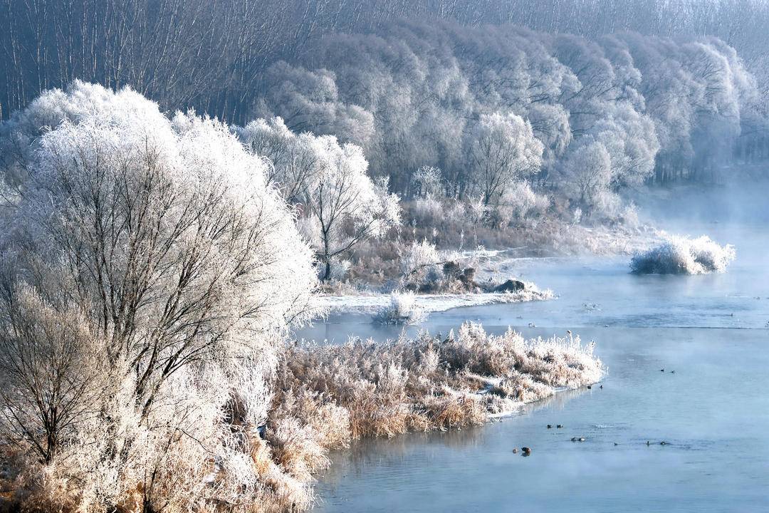 The lower reaches of the Daling River in Chaoyang City, Liaoning Province are covered in a blanket of white, with soft rime stretching for several miles along the banks, forming a spectacular landscape. Viewed from afar, the snow-white world unfolds an exceptionally dazzling visual feast, showcasing the beauty of winter in a dreamlike and enchanting way.