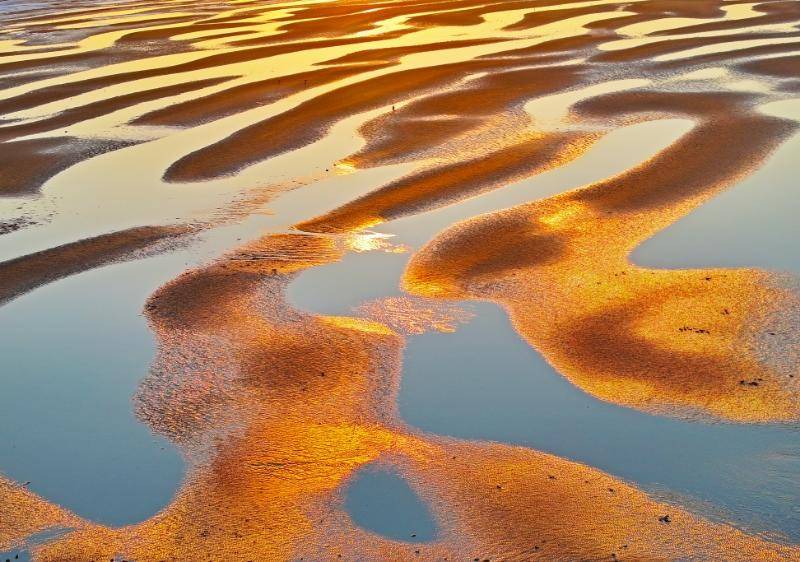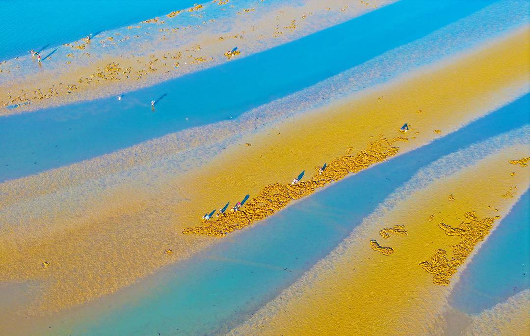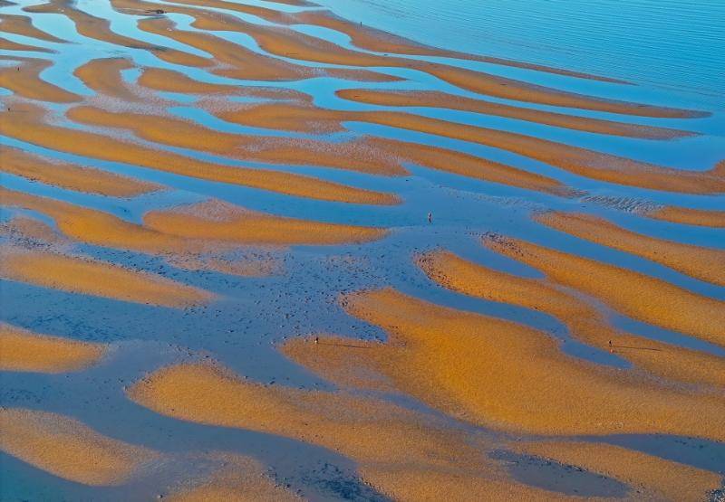 An aerial view of the northern Bohai Sea area near Ganjingzi District, Dalian City, Liaoning Province, shows how a receding tide scours out beautiful landscapes of sand dunes and water puddles on mudflats. Under the setting sun, the yellow-red sand and azure waters blend seamlessly, creating a breathtaking seaside panorama.