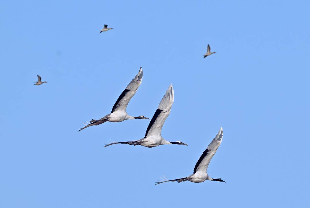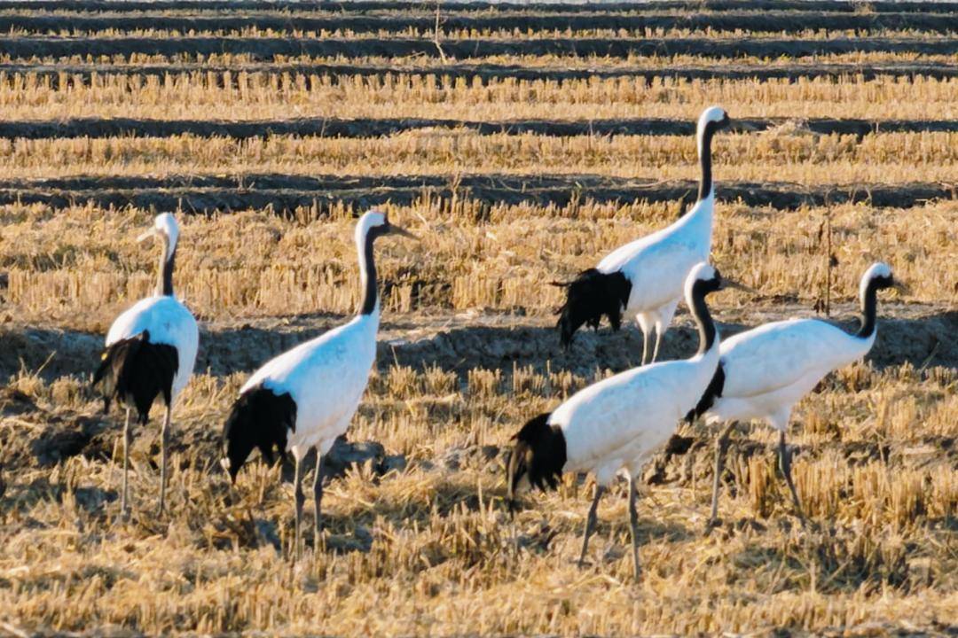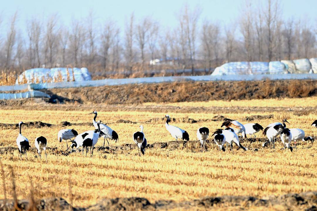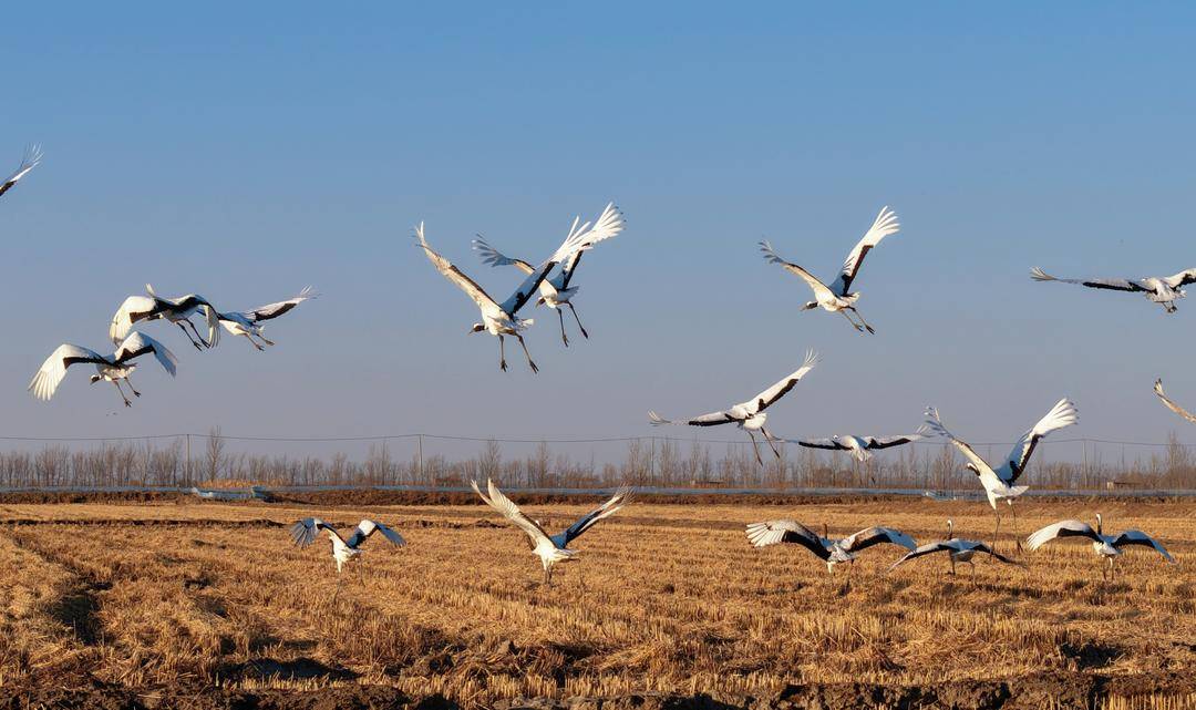 In the Liaohe River Delta of Panjin, Liaoning Province, two large flocks of wild red-crowned cranes can be seen foraging and resting peacefully in the distance. From time to time, they soar gracefully through the sky with their wings spread wide.