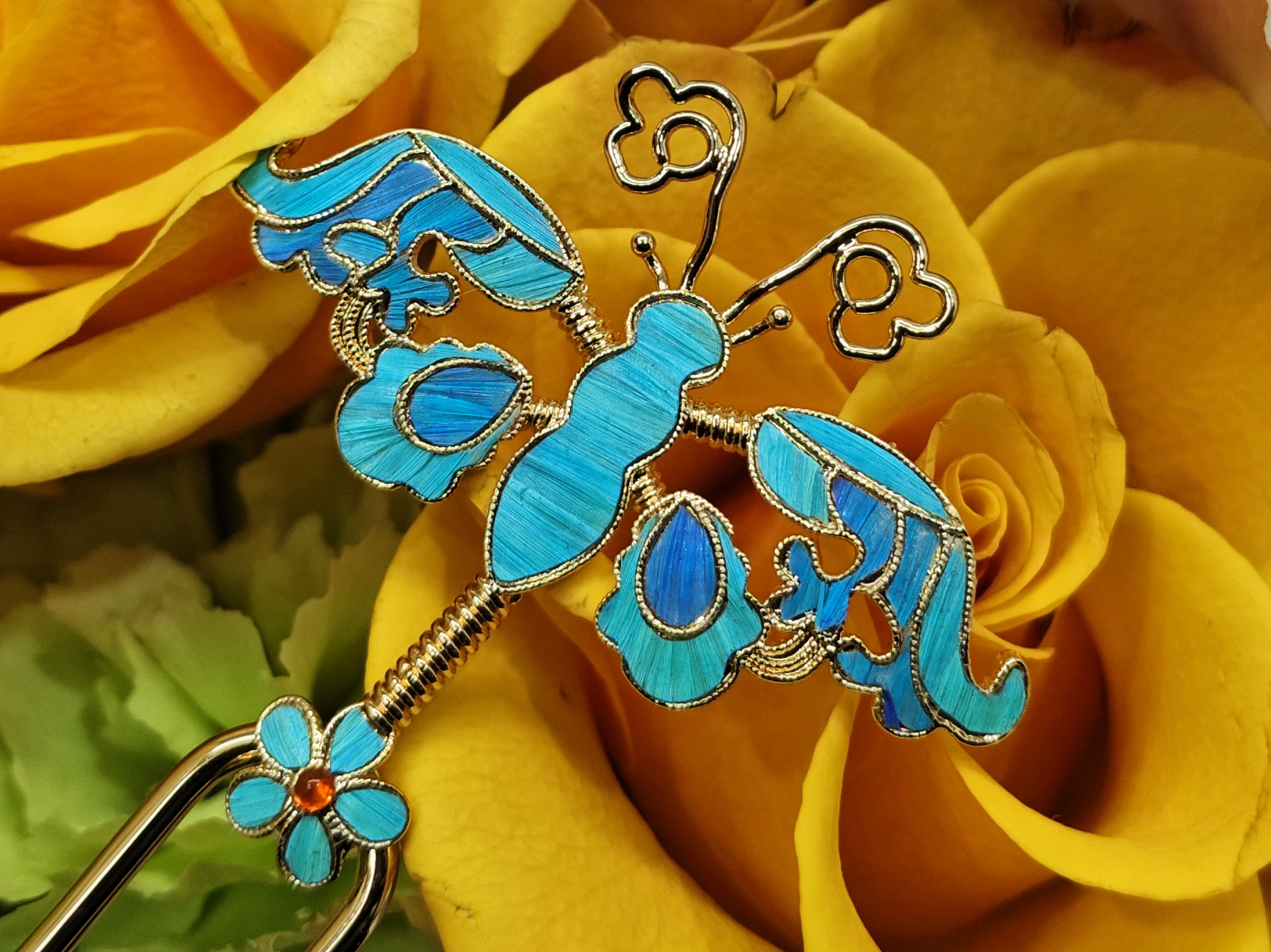 The diancui craftsmanship boasts a long history. As the classic work Han Feizi from the Warring States Period records, “(The treasure casket is) adorned with pearls and jade, and embellished with kingfisher feathers.” The raw material for this craftsmanship was kingfisher feathers. To protect wildlife, it now employs naturally shed parrot and peacock feathers. The general crafting process is as follows: First, bases of various shapes are made of fine metal wires such as gold and silver. Then, feathers are inlaid into a base, and glued together using a special adhesive. Diancui ornaments cannot be mass-produced by machinery, but only handmade; therefore, each work embodies the artisan’s dedication and affection.