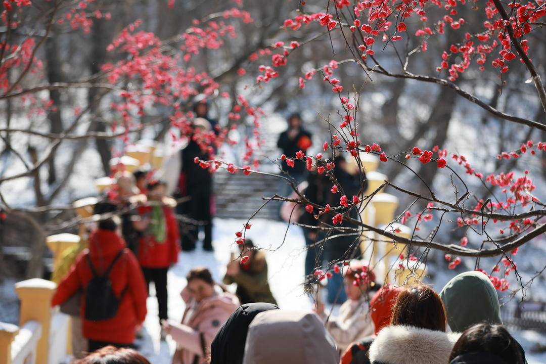At Qianshan Mountain in Anshan, Liaoning Province, artificially adorned plum blossoms bring a touch of elegance to the rugged peaks. Wandering through them feels like stepping into a living ink wash painting.