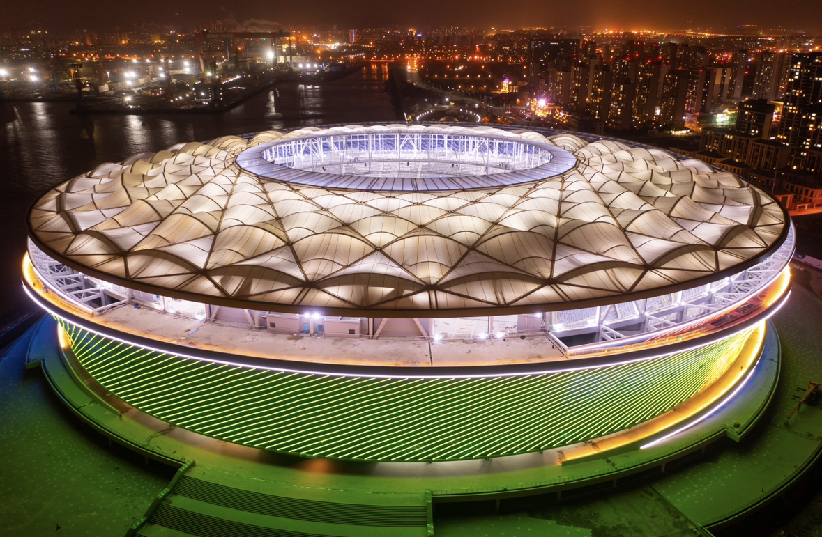 Dalian Suoyuwan Football Stadium offers more than just an exciting football match. Surrounded by the sea on three sides, it boasts a 270-degree ocean view and is China’s first football stadium with such a unique location, making it a new landmark in Dalian. Its design concept, “colorful overlapping waves,” integrates Dalian’s marine culture and football spirit. In terms of public welfare, the football stadium offers a large open space available to citizens free of charge, making it very accessible. In particular, a 2.2-kilometer jogging track around the football stadium leads directly to the top viewing platform, providing citizens with a great experience for leisure and fitness. Additionally, the white wave-like roof, dazzling ocean blue walls, sea wave-inspired seating, and the lush green turf in the center create a cohesive and visually pleasing color scheme. At night, the football stadium is illuminated with colorful lights, exuding an air of romance.