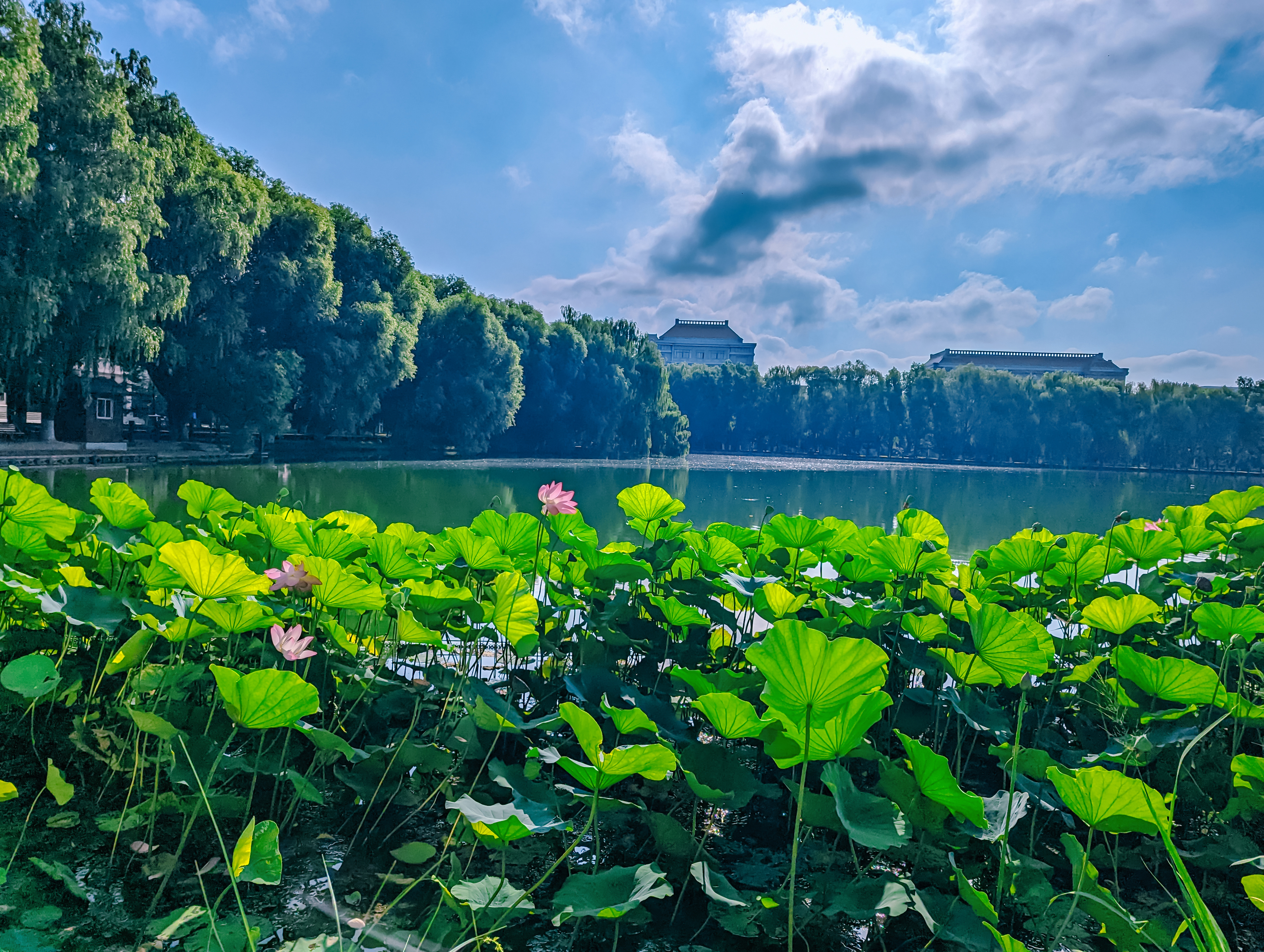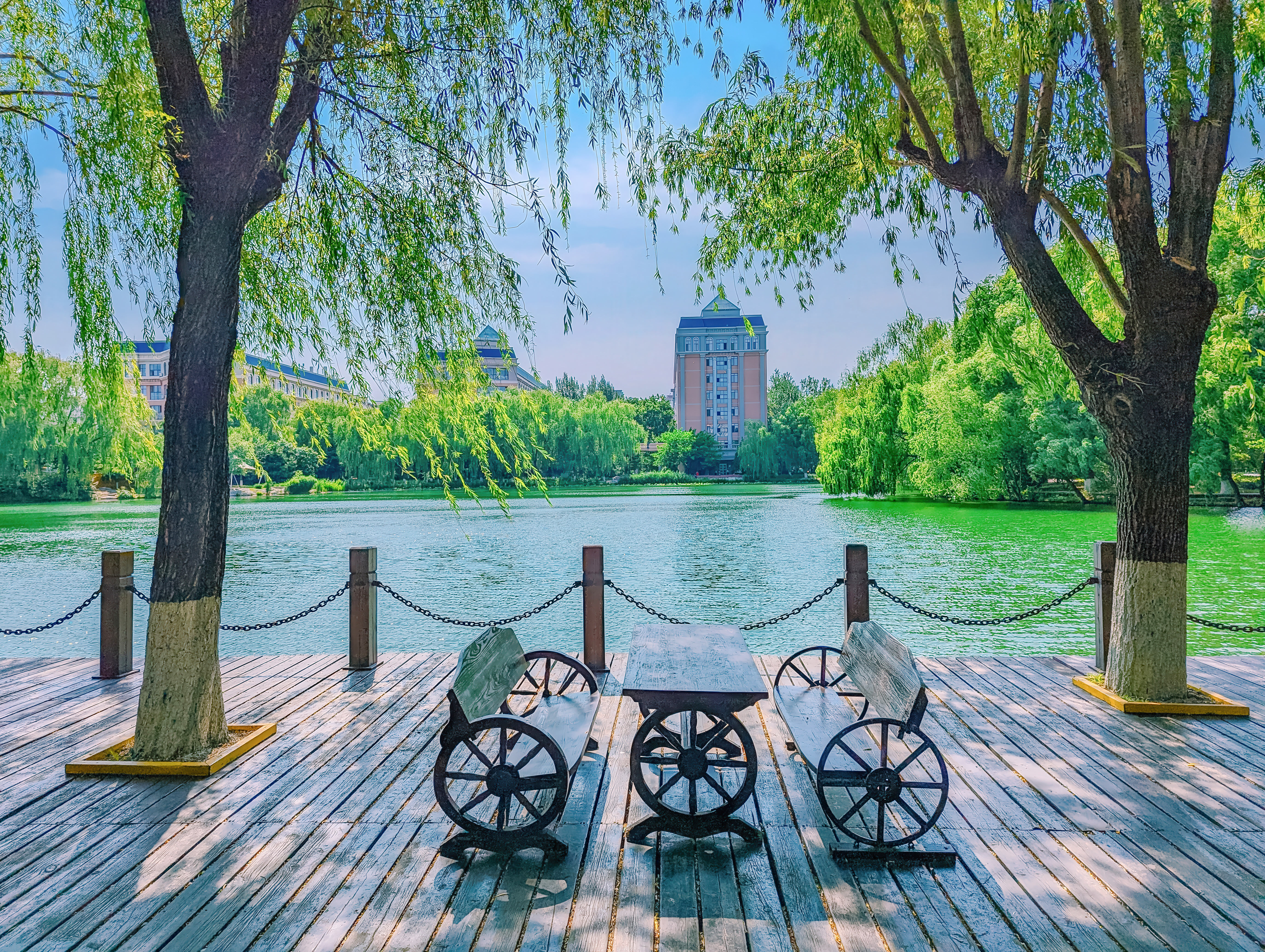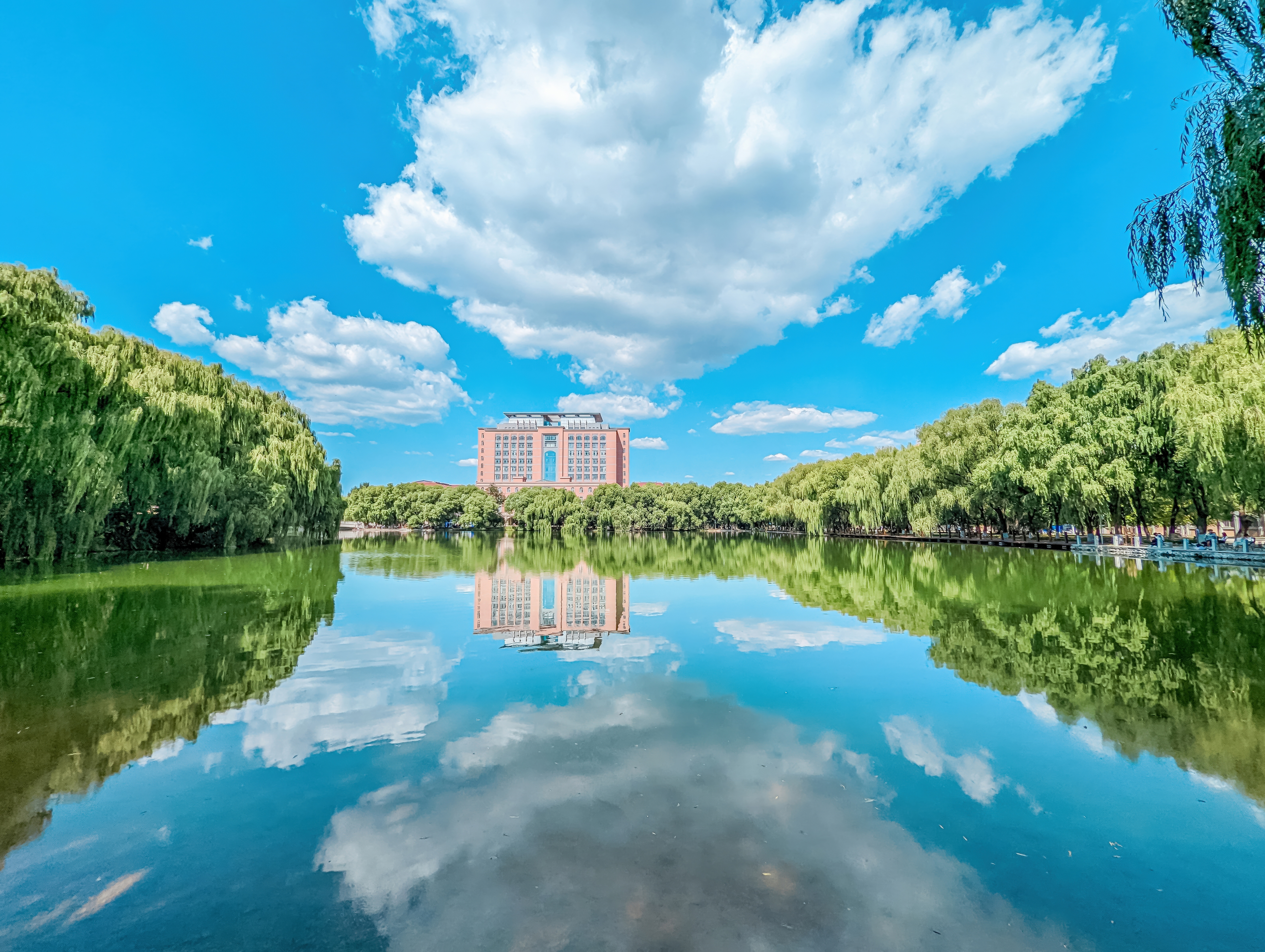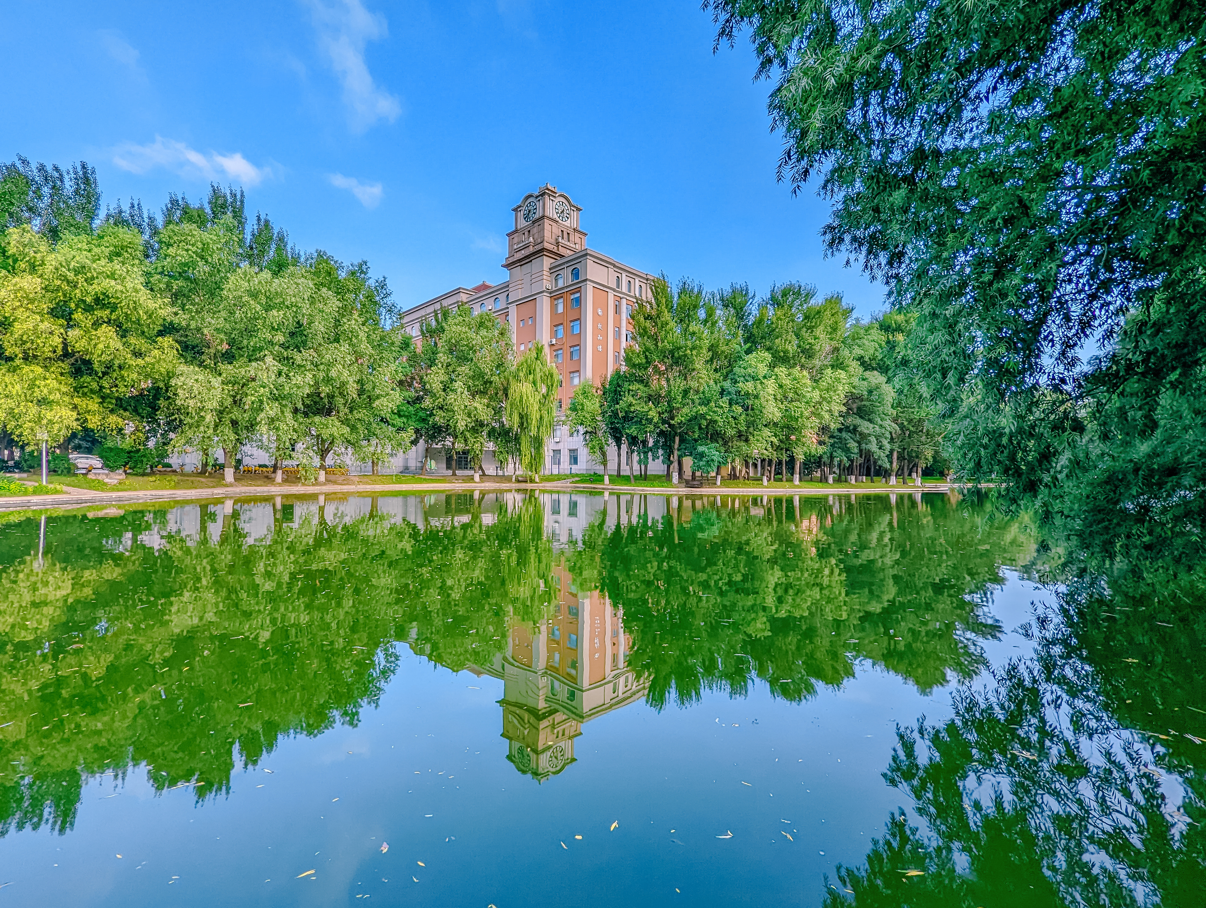 The autumn scenery at Bohai University is picturesque, featuring clear lakes and buildings that harmonize with the greenery, creating a tranquil and beautiful atmosphere.