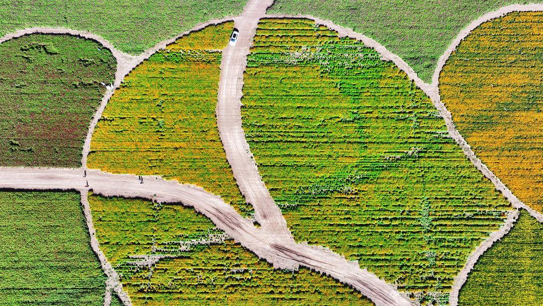In Beipiao County-level City, Liaoning Province, a vast sea of flowers shimmers with shades of silver-yellow, orange-yellow, pink, and purplish-red. Tourists, delighted by the floral spectacle, eagerly capture its beauty with their cameras.