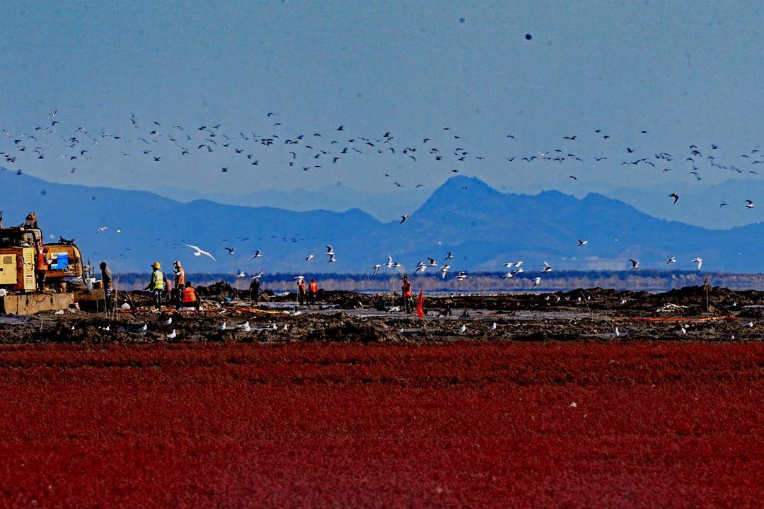 In Yingkou, Liaoning Province, the Daliaohe River Estuary Wetland is adorned with a vast expanse of red seepweed. This stunning landscape, harmoniously complemented by birds in flight, is becoming a major draw for nature lovers.