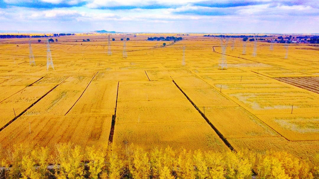 The fields in Shenbei New District of Shenyang City, Liaoning Province are covered in a golden hue. The golden waves of rice and the villages in the distance add radiance and beauty to each other, forming a magnificent autumn harvest scene.