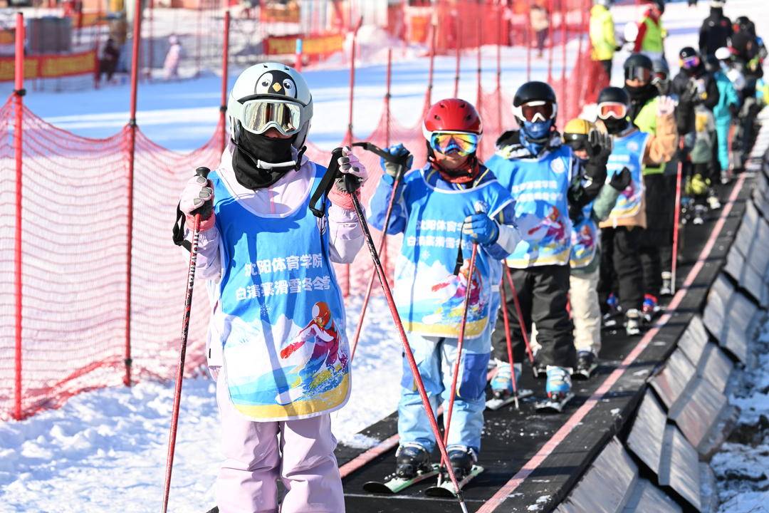At Shenyang Baiqingzhai Ski Resort, a dozen children in bright ski suits, fully equipped with helmets, ski poles and protective gear, glided slowly down the slopes under their instructors’ guidance, reveling in the joy of skiing.