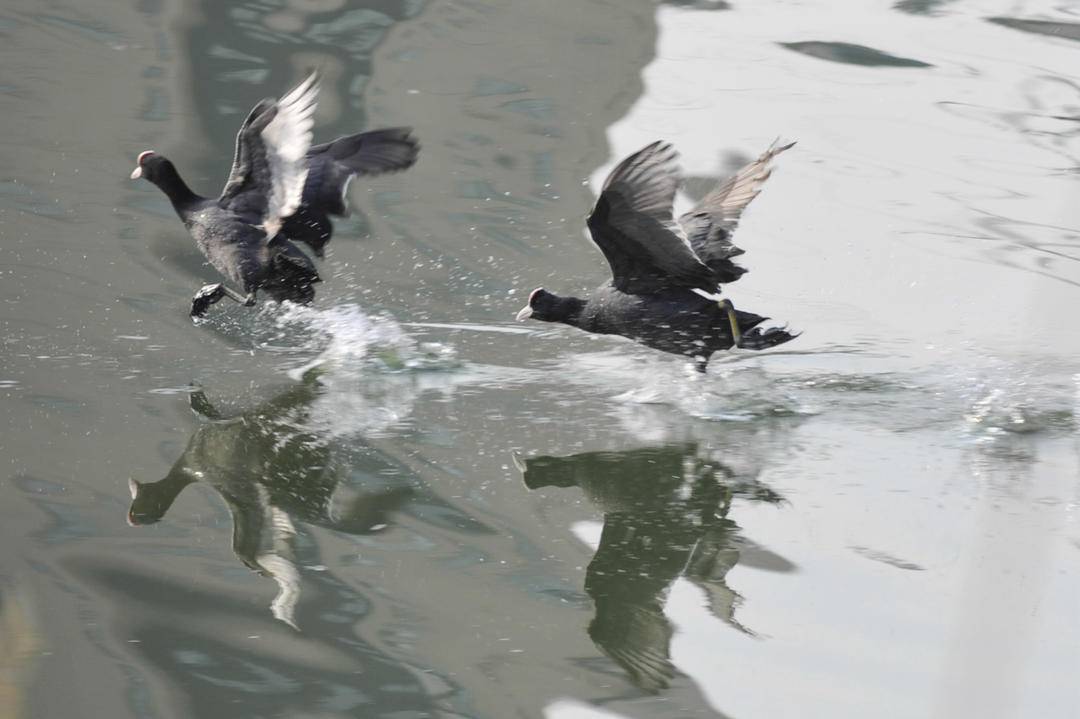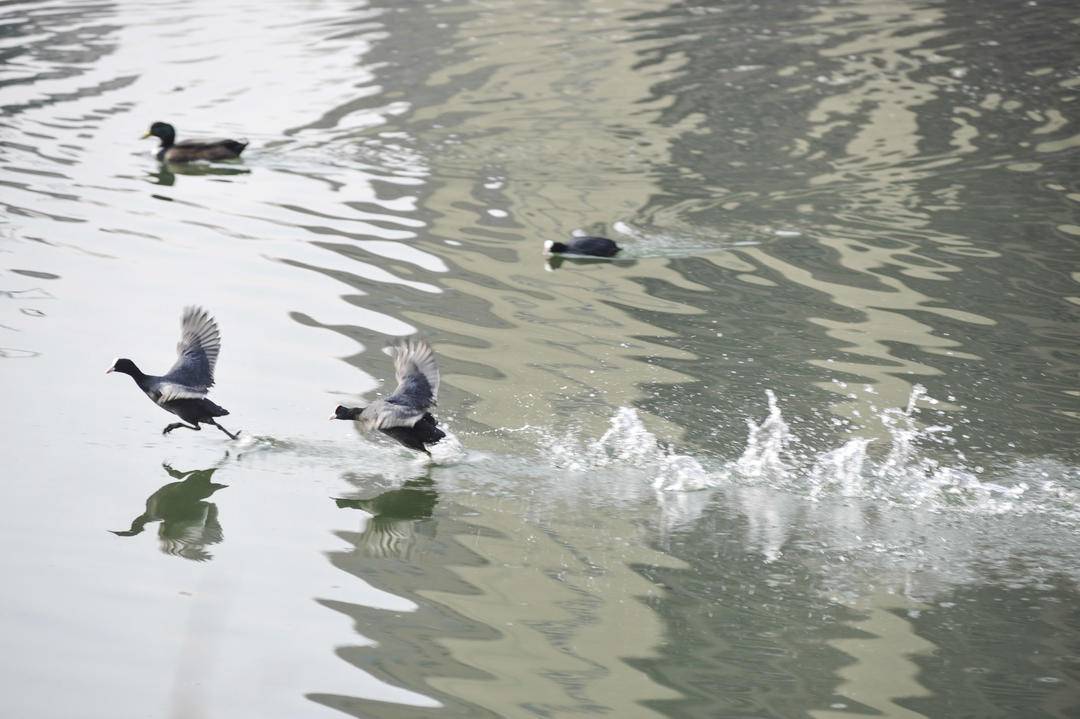 At the Nanshahe River in Anshan City, Liaoning Province, flocks of wild birds including common coots and mallards are frolicking and foraging on the water, infusing the city with vibrant life.