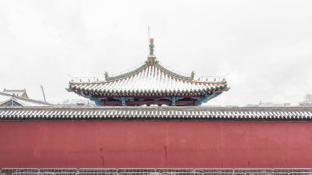 A spring snow falls on the Shenyang Imperial Palace in Liaoning Province, draping the ancient complex in a pristine white coat. The crimson walls and golden tiles create a breathtaking contrast against the pure snow, forming a serene visual feast.