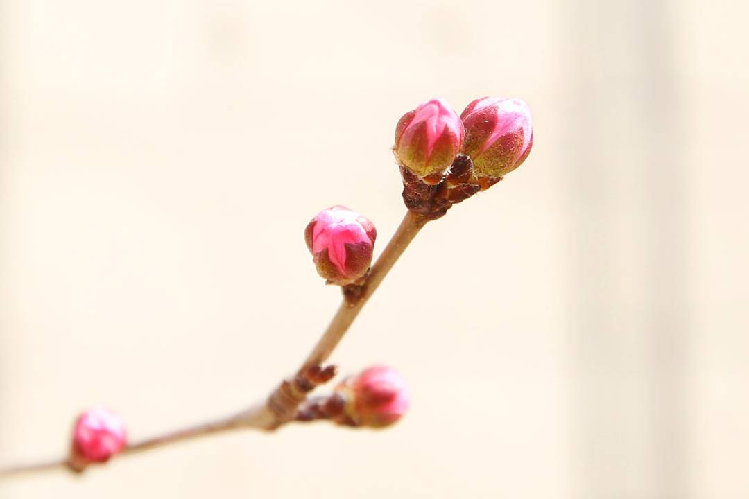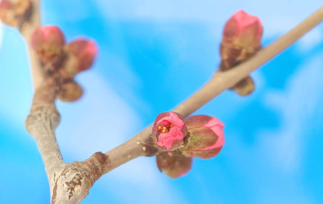 Spring breezes brush against the peach blossom branches in Shenyang, Liaoning Province. Tiny pink buds adorn the twigs, quietly preparing to bloom as they embrace the gentle warmth of spring.