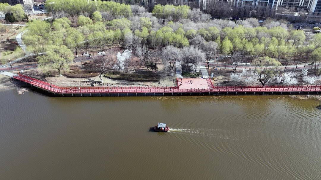 Bathed in warm spring sunshine, both banks of the Puhe River in Shenyang, Liaoning Province are adorned with pink peach blossoms and fresh green willows, creating a delightful contrast.