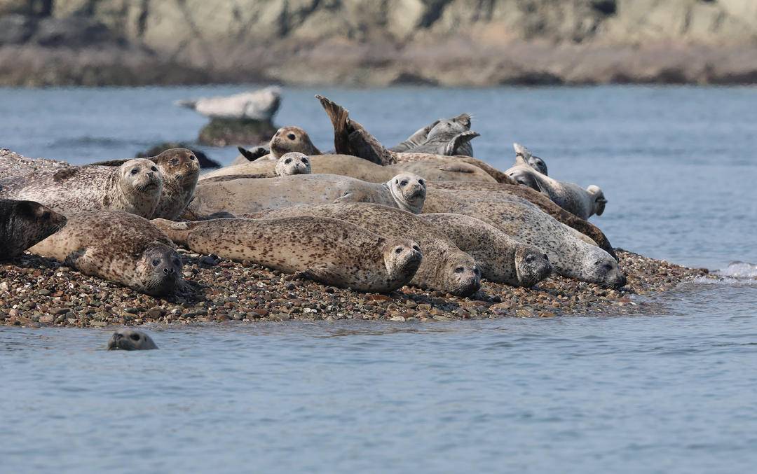 A group of plump spotted seals are lying on sandbanks at the Dalian Spotted Seal National Nature Reserve in Liaoning, basking in the sun with their bellies up.