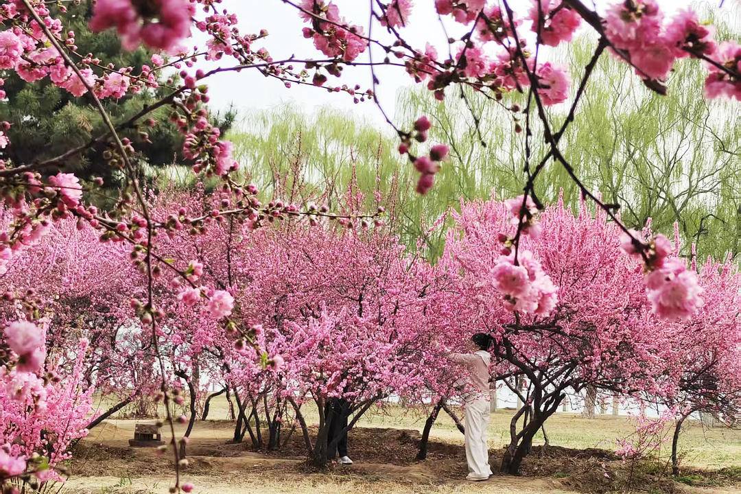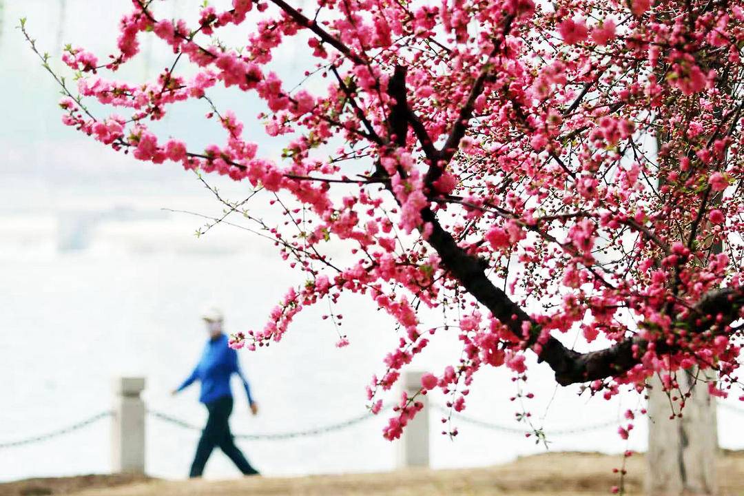On the banks of the Daling River, Chaoyang, Liaoning Province, pink flowering plums are in full bloom. Their delicate blossoms are mirrored in the gentle water, painting a breathtaking spring scene. Would you come for a spring walk here?