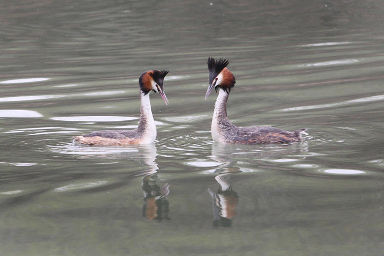 Spring arrives at Dingxiang Lake in Shenyang, Liaoning Province. Paired great crested grebes swim and play on rippling water, showing the beauty of Liaoning’s natural ecology.