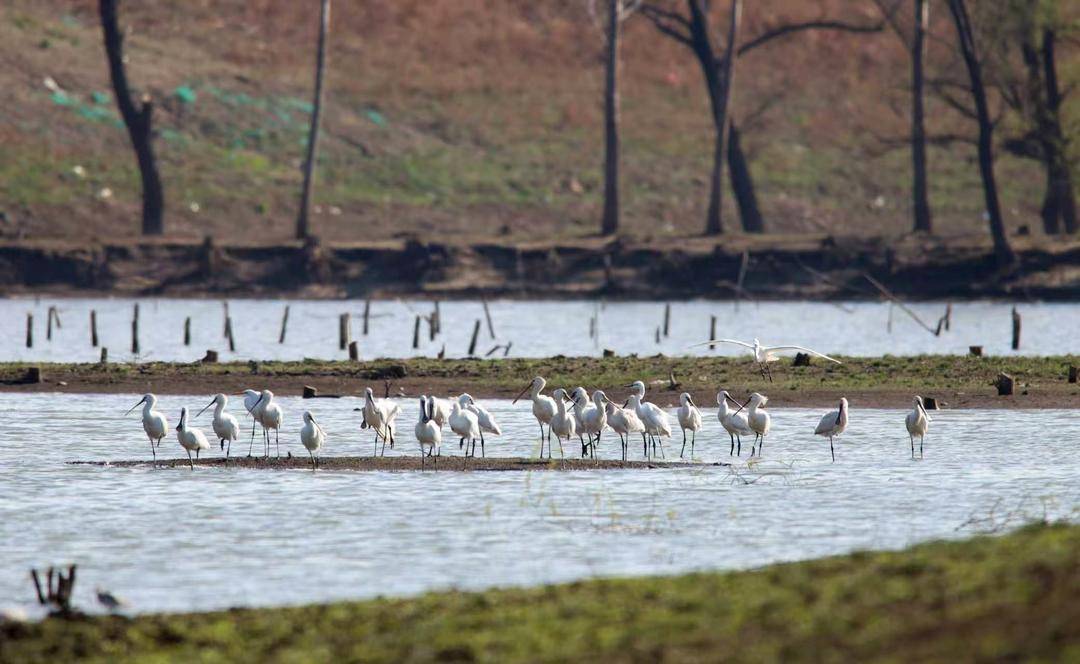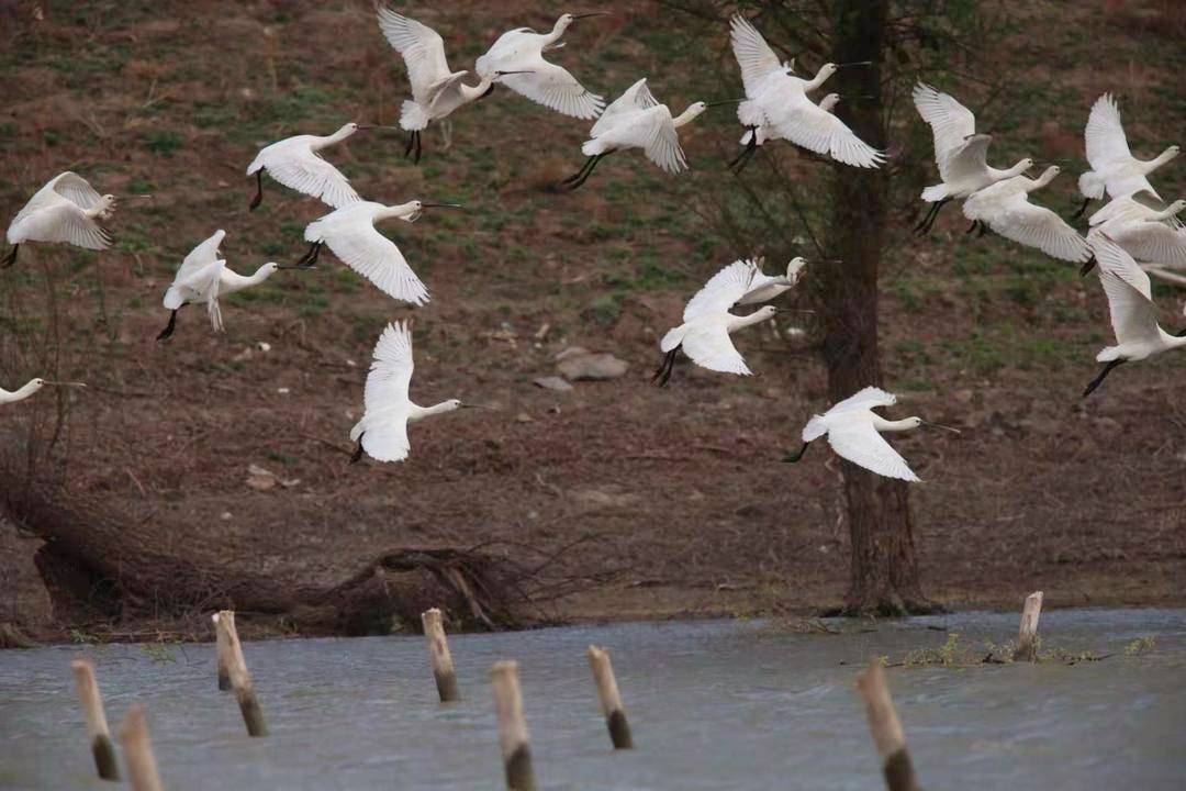 In recent days, dozens of white spoonbills have been spotted at the Liaohe River Cultural Tourism Zone in Tai’an County, Anshan City, Liaoning Province. They wander along the shallows in search of food at times, and glide over the water with fluttering wings. Their graceful forms blend harmoniously with the shimmering river and the vast reed marshes.